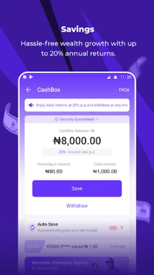 Gano PalmPay, ingantaccen tsarin biyan kuɗi wanda aka ƙirƙiro shi don biyan buƙatun kasuwancin zamani. Yana ba da mafita mai sauri, inganci, da aminci ga duk wata ma'amalar ku ta kan layi ko ta shago. Tare da PalmPay, zaka iya gudanar da duk ayyukan biyan kuɗinka cikin sauƙi, bin diddigin ma'amaloli a ainihin lokaci don tabbatar da gudana na kuɗi mai kyau. Haka kuma, muna ba da zaɓuɓɓukan ajiyar kuɗi masu sassauƙa tare da manyan ribar yau da kullun har zuwa 20% a kowace shekara, kuma duk cire kuɗi kyauta ne. PalmPay yana haɗin gwiwa da abokan harka sama da 500, yana goyan bayan duk nau'ikan biyan kuɗi, kuma yana ba da kyaututtuka masu ban mamaki ga sababbin masu amfani, canja wurin kuɗi kyauta, da kuma damar cashback a kowace ciniki.