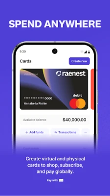 Tare da Raenest, za ku iya buɗe asusun ajiyar kuɗi na duniya a cikin sunan ku don USD, GBP, da EUR a cikin mintuna kaɗan, ba tare da buƙatar takarda ba. Karɓi biyan kuɗi daga abokan ciniki, kasuwanni, ko dangi a faɗin ƙasashe sama da 190. Canza kuɗaɗe nan take a farashin kasuwa na hakika ba tare da wani ɓoyayyen kuɗi ba, kuma adana kuɗin ku cikin amintacce a cikin kuɗaɗe daban-daban na duniya. Bugu da ƙari, Raenest tana ba da katunan USD na zahiri da na jiki waɗanda ke aiki a ko'ina, suna ba da damar biyan kuɗi ba tare da taɓa waya ba ta hanyar Google Pay da kuma tabbatar da cewa kuna kashe kuɗi a duniya ba tare da farashin da ba zato ba tsammani ko iyakoki ba. Aika kuɗi cikin aminci da nan take zuwa ƙasashe sama da 50 a faɗin duniya, kuna jin daɗin kuɗin aikawa mai sauƙi da musayar kuɗi mai bayyananne, cikakke ga buƙatun kasuwancin ƙetare iyaka.